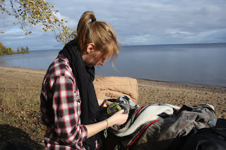 Liisi paigaldamas verivärsket bussireisi embleemi Äänisjärve kaldal. Pilti tegi Laura. |